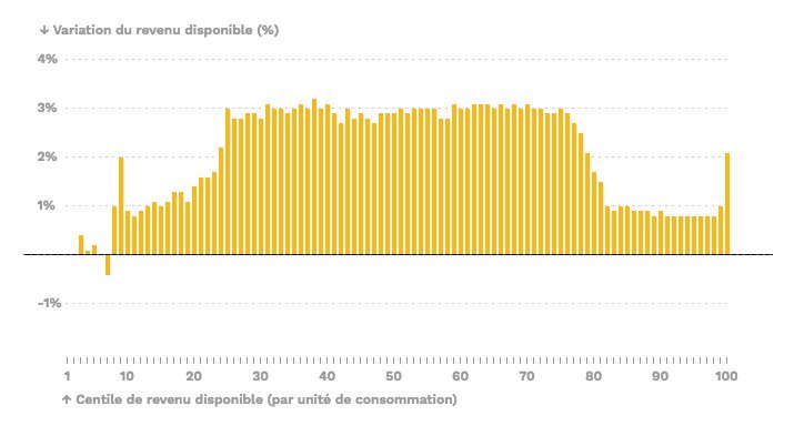 au micro de France Inter, qui dévoilait le scoop hier matin. Sa chronique est ici. Je vous la résume : oui, certes, d'accord, admettons, les super-riches ont gagné aux réformes fiscales de Macron, mais ils ont gagné (en pourcentage) moins qu'on le dit. Et ils ont gagné (toujours en pourcentage) moins que les classes moyennes. Et moins que l'an dernier. Ah, c'est dur pour tout le monde ! Il faut écouter ce petit bijou de manipulation des chiffres et d'argumentation de dame patronnesse. A l'appui, le journal de Dominique Seux publiait à la Une ce beau graphique.