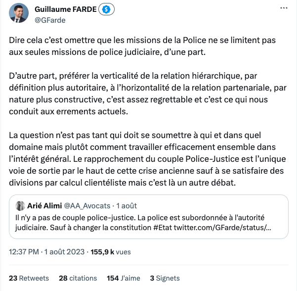 En tous cas, si l'offensive policière devait se poursuivre à la rentrée pour échapper à la Justice, les éléments de langage sont prêts, y compris les plus inattendus. Lisons par exemple sur Twitter (rebaptisé X) le "chroniqueur police" de BFMTV Guillaume Farde, qui plaide avec des trémolos pour le "couple police-justice"