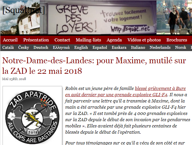 Robin a écrit un texte pour Maxime. Maxime est ce jeune zadiste de Notre-Dame-des-Landes dont une autre grenade GLI-F4 a emporté la main droite. Je vous en parlais hier. Et on vous raconte aussi comment la plupart des medias qui l'ont relaté se sont contentés de reprendre la version des autorités : Maxime avait empoigné la grenade pour la relancer. Les zadistes trouvent cette version invraisemblable. Je ne sais pas qui a raison. N'empêche que tout l'appareil médiatique n'a repris que la version des autorités.