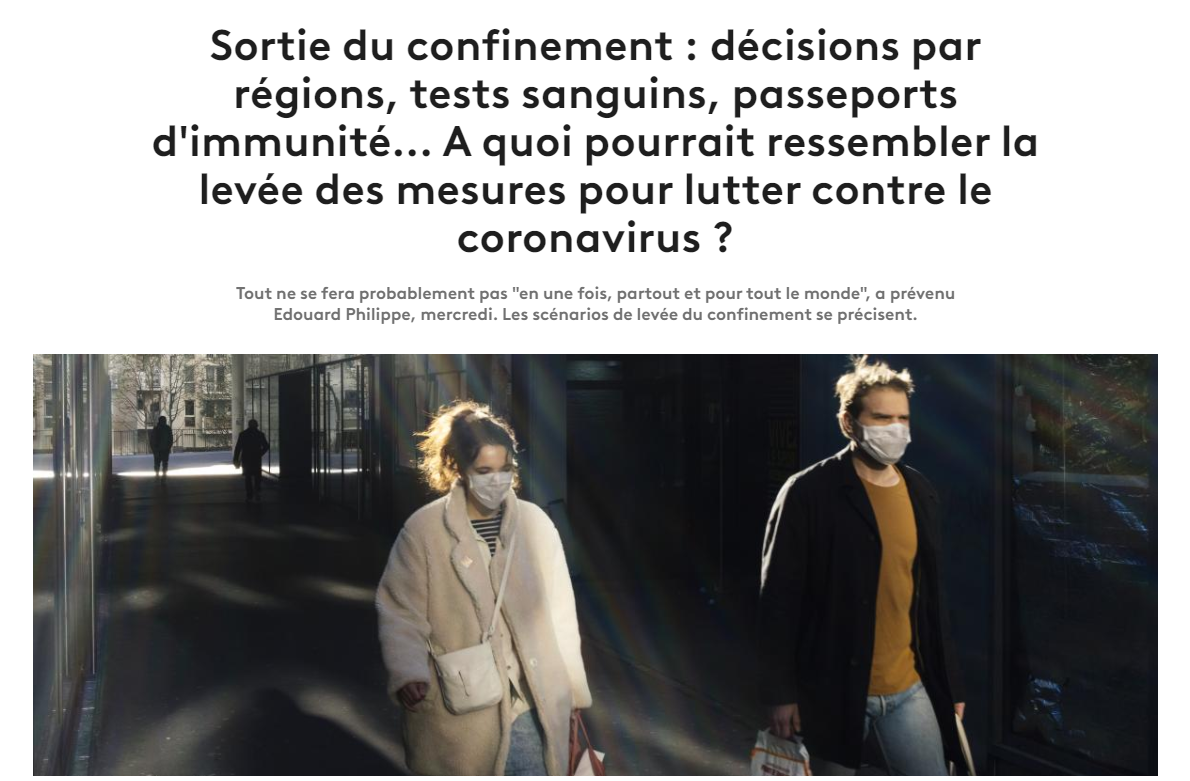 Une chose est sûre : il faudrait des tests. On n'en a pas. On en trouvera peut-être d'ici juin, si les Américains nous en laissent. D'ici juin, car l'objectif du gouvernement, apprends-je toujours dans la même enquête, serait d'être capables de tester les infectés symptomatiques...en juin. Pour les a-symptomatiques (tout aussi potentiellement contaminants, je le rappelle), on verra plus tard. Il faudra aussi tester les immunisés (c'est un test différent). Encore que ces tests-là ne sont pas encore au point, et qu'on n'est pas certain qu'un apparemment immunisé le soit réellement.