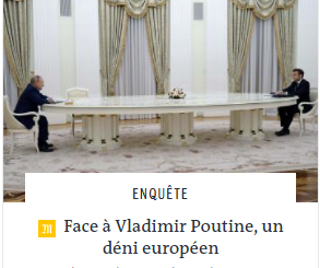 Je précise : Européens de l'Ouest. L'Est, qui se souvenait de la dictature soviétique, était bien moins indulgent. À l'Ouest se mêlaient, à gauche, l'hostilité post-communiste à l'Otan, et à l'extrême droite, les intérêts financiers, la fascination pour l'Homme Fort, le vrai de vrai, pas ramolli par la décadence occidentale, et une aveuglante idéologie europhobe (à vous de coller sur cette phrase les noms propres de votre choix). Enfin dans la droite néolibérale, régnait la conviction que les intérêts bien compris du commerce finissent toujours par l'emporter sur les passions nationalistes, s'ils sont expliqués avec pédagogie, fût-ce aux deux bouts d'une longue table. Comme si la planète entière ne pouvait finalement que se rallier aux Powerpoints de McKinsey, et aux analyses pénétrantes de l'Institut Montaigne. Telles sont les composantes de ce qu'un Marc Bloch ressuscité pourrait appeler "L'étrange déni"