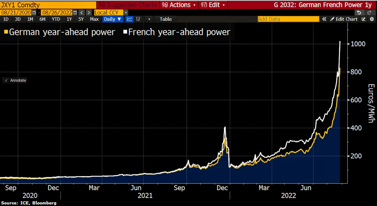Vous avez peut-être vu passer ce schéma, sur la hausse vertigineuse du prix de l'électricité, dans la dernière année, sur le marché de gros. On est passé de 85 à 1 000 euros le mégawatt-heure (MWh), pour de l'électricité fournie au cours de l'hiver 2023. Vous vous dites qu'il y a une erreur d'un zéro ? Non. C'est bien de 85 à 1 000. Ce qui ne signifie pas que la facture des particuliers sera multipliée par douze. Pas d'affolement ! Ce sera "seulement" par deux, ou par trois. Youpi !