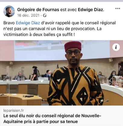 la tenue portée par l'élu écologiste au conseil régional de Nouvelle-Aquitaine Karfa Diallo, une tunique en bogolan, tissu précieux du Mali et fabriqué à la main (nous apprenait à l'époque le Parisien