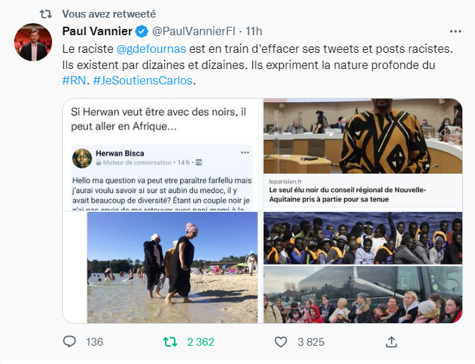 Grégoire de Fournas a apparemment effacé ce tweet, comme plusieurs autres, selon le député LFI Paul Vannier.