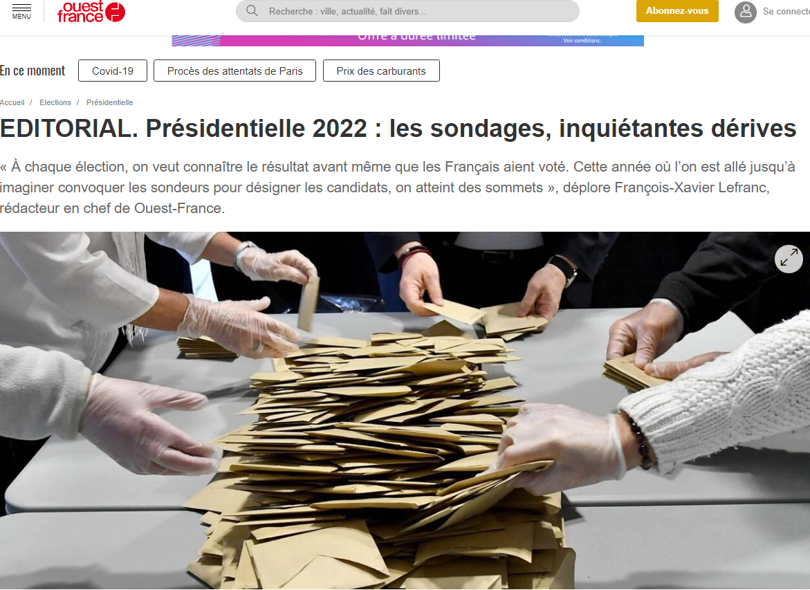 ne commentera même plus les sondages commandés par ses concurrents, annonce son rédacteur en chef François-Xavier Lefranc. Cette initiative radicale s'est aussitôt assurée de chaleureuses félicitations sur les réseaux sociaux, et dans la classe politique (voir ici celle du socialiste Olivier Faure, qui rappelle avec raison le dernier fiasco sondagier en date, sur le score des socialistes aux dernières régionales). Les Titanic sondagiers sont désormais un ingrédient obligé, et distrayant, des soirées électorales. Si un sondeur masochiste réalisait dans l'opinion un sondage sur l'initiative de Ouest-France