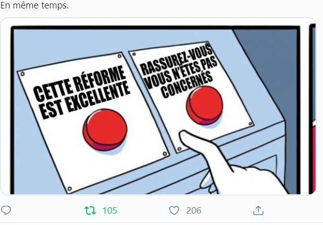 D'autres, partout, souligneront les coutures trop visibles du beau tapis. Comment la "retraite minimum" de 1000 euros est un cadeau en trompe-l'œil. Comment les générations seront impactées non pas à partir de la "génération 75", mais de la génération 59. Comment se profile un chantage aux profs.