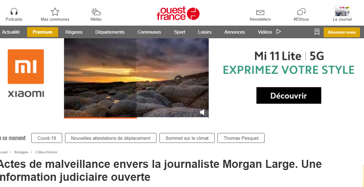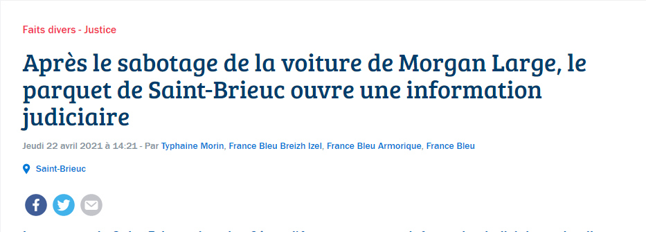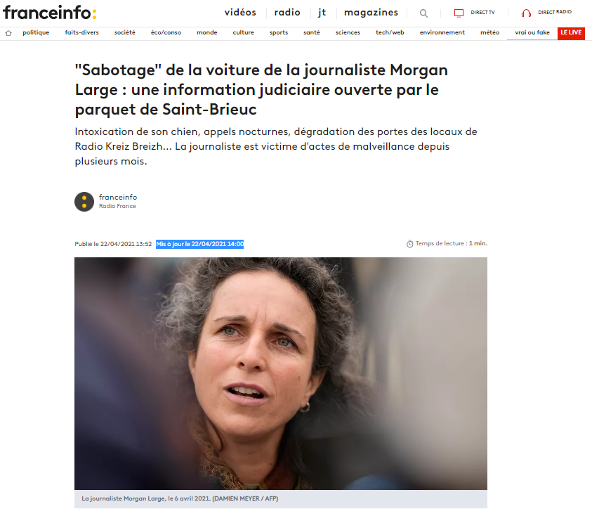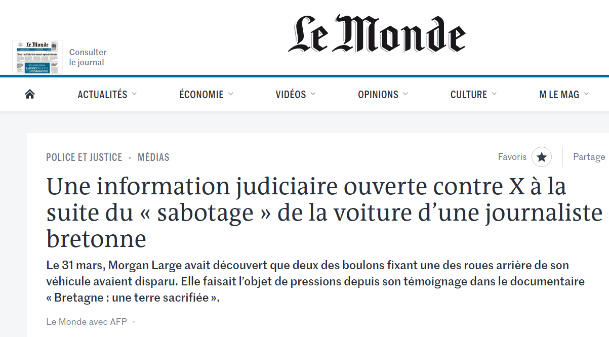 Enfin une information judiciaire a été ouverte, le 22 avril, après le sabotage fin mars de la voiture de la journaliste de Radio Kreiz Breizh Morgan Large, qui enquête en Bretagne sur l'industrie agro-alimentaire. Il aura fallu une large mobilisation, notamment de Reporters sans frontières, un grand rassemblement de soutien à Rostrenen (Côtes-d'Armor), une chronique du rubriquard écologie du Monde