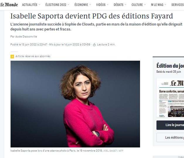 a ensuite tenu le feuilleton minutieux de l'arrivée à la tête de Fayard de la successeure de Sophie de Closets, la journaliste (et compagne de l'ex-candidat EELV Yannick Jadot) Isabelle Saporta. Cette arrivée s'est traduite par le départ de Fayard de nombreux auteurs à succès (dont Davet et Lhomme), désireux de suivre la PDG débarquée de Closets dans ses futures fonctions (de PDG de la maison Flammarion, filiale de Gallimard, selon des sources concordantes). Il faut dire que le Monde