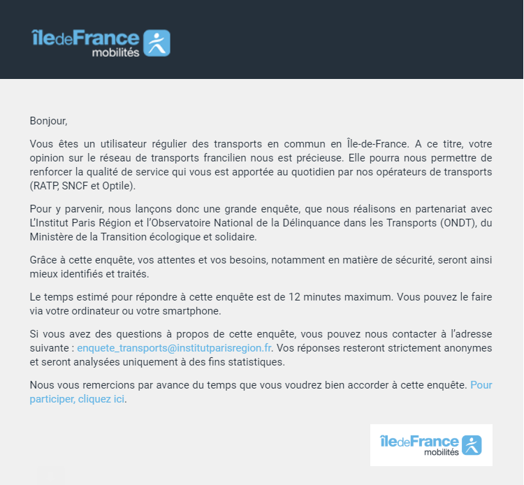 Une amie francilienne, qui a la chance d'effectuer chaque jour le trajet ferroviaire Melun-Paris, a récemment été sondée, par "Ile de France Mobilités". Elle ne l'a pas réalisé immédiatement, mais elle fait partie des 525 000 abonnés Navigo et Imagin'R qui, ayant laissé leur adresse mail, ont été pareillement sondés (opération groupée d'un tas de bidules régionalo-ferroviaires, tous placés sous la haute autorité de Mme Valérie Pécresse).