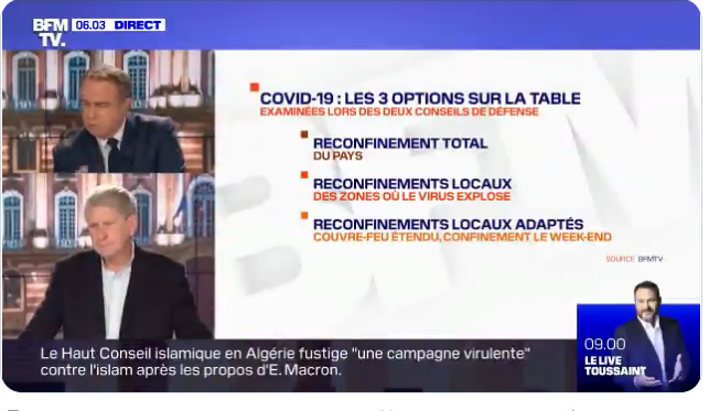 Tout ça pour les vieux, les gros, les cardiaques : au premier confinement, si on le pensait, on ne le disait pas. On se tenait. On procédait par allusions. On était tous solidaires. On parlait des "personnes vulnérables", des "personnes à risque", et chacun comprenait. Mais ce soir, l'énervement suit les courbes exponentielles. BFM a beau tenter d'ordonner le débat avec de beaux panneaux en trois parties, façon Sciences Po, sur "les trois options sur la table" de Macron (confinement comme en mars, sauf l'école et en plus court, confinement le week-end avec couvre-feu à 19 heures, confinements durs mais localisés) plus personne ne s'écoute. Même "un proche de Macron"