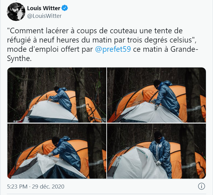 D'ailleurs, ce ne sont pas les policiers qui lacèrent les tentes, mais des intérimaires des entreprises de nettoiement, sous-traitantes de la préfecture. Et d'ailleurs encore, dès que notre bon ministre de l'Intérieur en a été informé, il a ordonné que cessent les lacérations. Qui ont en effet cessé (ou presque), même si les tentes sont toujours envoyées à la benne. D'ailleurs (encore), la ministre Marlène Schiappa en personne est venue constater le nouveau processus de "valorisation et de récupération"