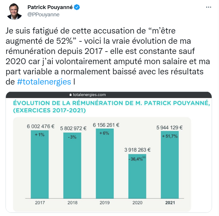 : ainsi commence l'étrange tweet du PDG de Total énergies, Patrick Pouyanné, par lequel le patron de la multinationale pétrolière entend rétablir la vérité sur ses rémunérations. Ce tweet, par lequel Pouyanné semble tenter de se fondre dans la fatigue générale (fatigue démocratique, fatigue d'après-Covid, etc.), le voici :