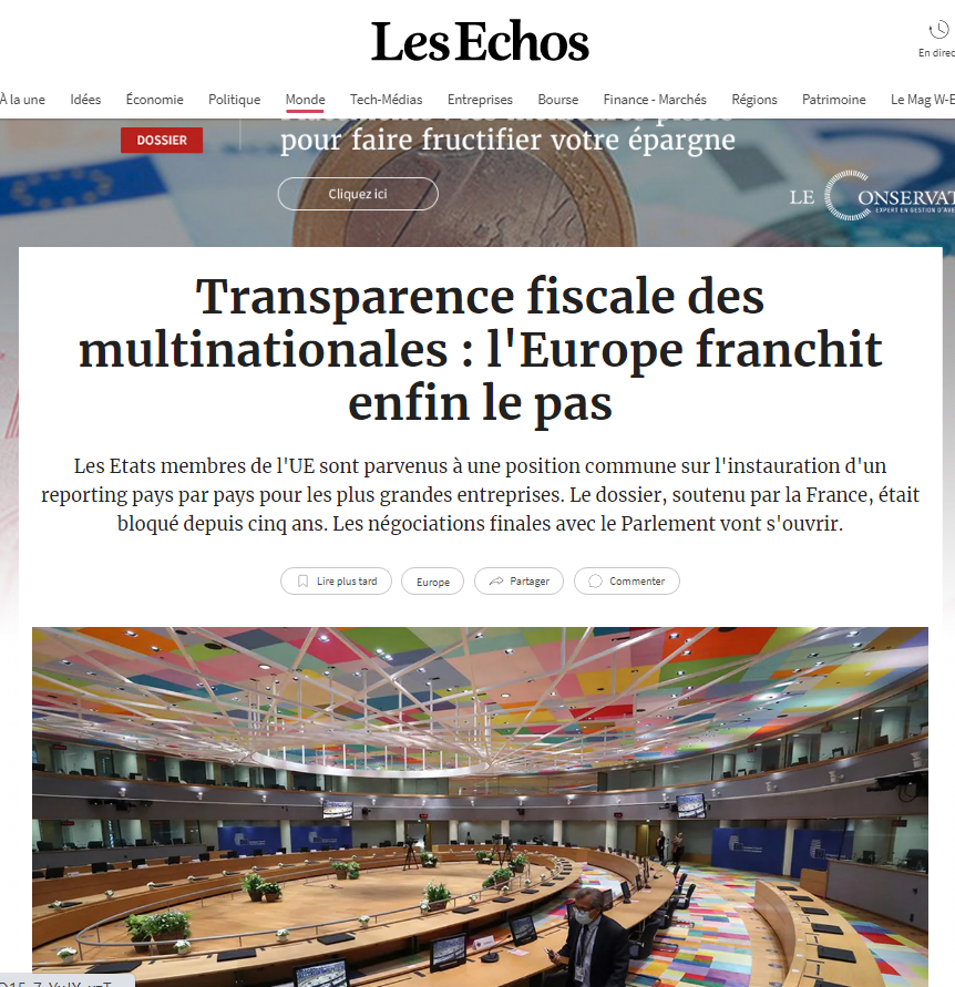 . Combat de longue haleine, qui semblait gagné depuis qu'en février, un accord avait été trouvé entre États-membres. Les multinationales établies en Europe devraient publier chaque année leurs données financières, pays par pays. Alleluia ! Même Les Échos