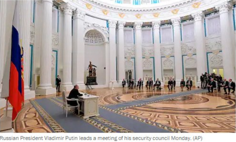 , comme (après la table kilométrique) la "consultation" ubuesque du Conseil de sécurité russe, dans une salle immense du Kremlin, avec son air de grand oral devant un prof implacable.