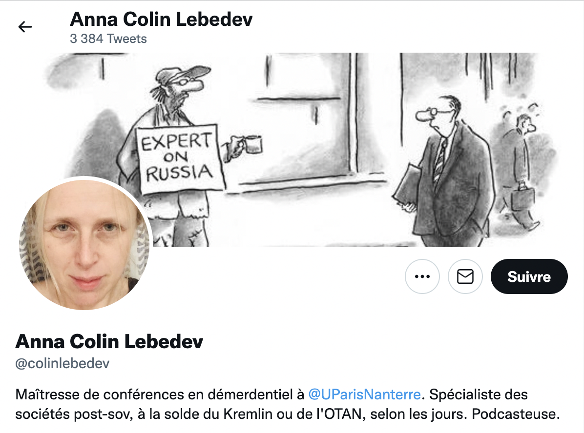 On pourrait en tirer la conclusion hâtive que la recherche sur le monde post-soviétique n'est que la continuation du conditionnement opéré dans les jeux d'enfants : aux garçons les petits soldats, aux filles les soins à leurs poupées. Intérêts personnels des unes et des autres ? Impitoyable répartition genrée des recherches les mieux financées ? Dans quelle mesure les jeux de pouvoir au sein de l'institution renforcent-ils cette tendance (à noter que le profil Twitter lui-même d'Anna Colin Lebedev est une dénonciation ironique de la situation) ? Cela mériterait bien quelques travaux de recherche.
