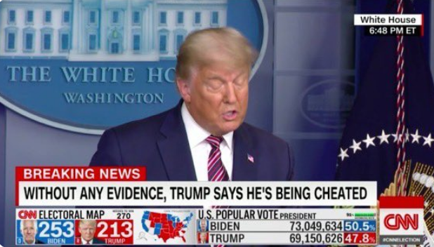 , a dit Trump. Certes : mais c'est pour interdire aux perturbateurs de les photographier, ce qui est interdit par la loi. Et tout est à l'avenant. Toujours en Pennsylvanie, selon les divagations de Trump, des observateurs ont été empêchés d'observer le dépouillement, raison pour laquelle il qualifie de "votes illégaux"