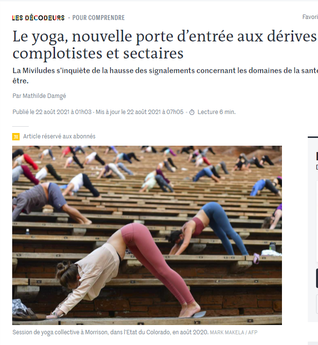 , publiée le 22 août, et titrée "Le yoga, nouvelle porte d'entrée aux dérives complotistes et sectaires"