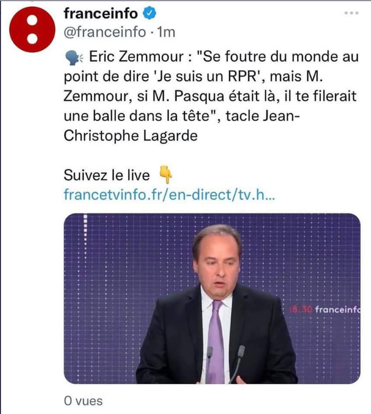 Pourquoi Franceinfo revient-elle sur sa ligne, alors qu'elle n'y est nullement obligée ? Responsabilité citoyenne, ou sirènes du buzz ? Elle ne sait plus où elle en est, par rapport au cas Zemmour. La veille, à la même heure, c'est le centriste Jean-Christophe Lagarde, maire UDI de Drancy, qui était invité de la même émission, et réagissait à la déclaration d'amour de Zemmour aux gaullistes. "Si M. Pasqua était là, il te filerait une balle dans la tête"