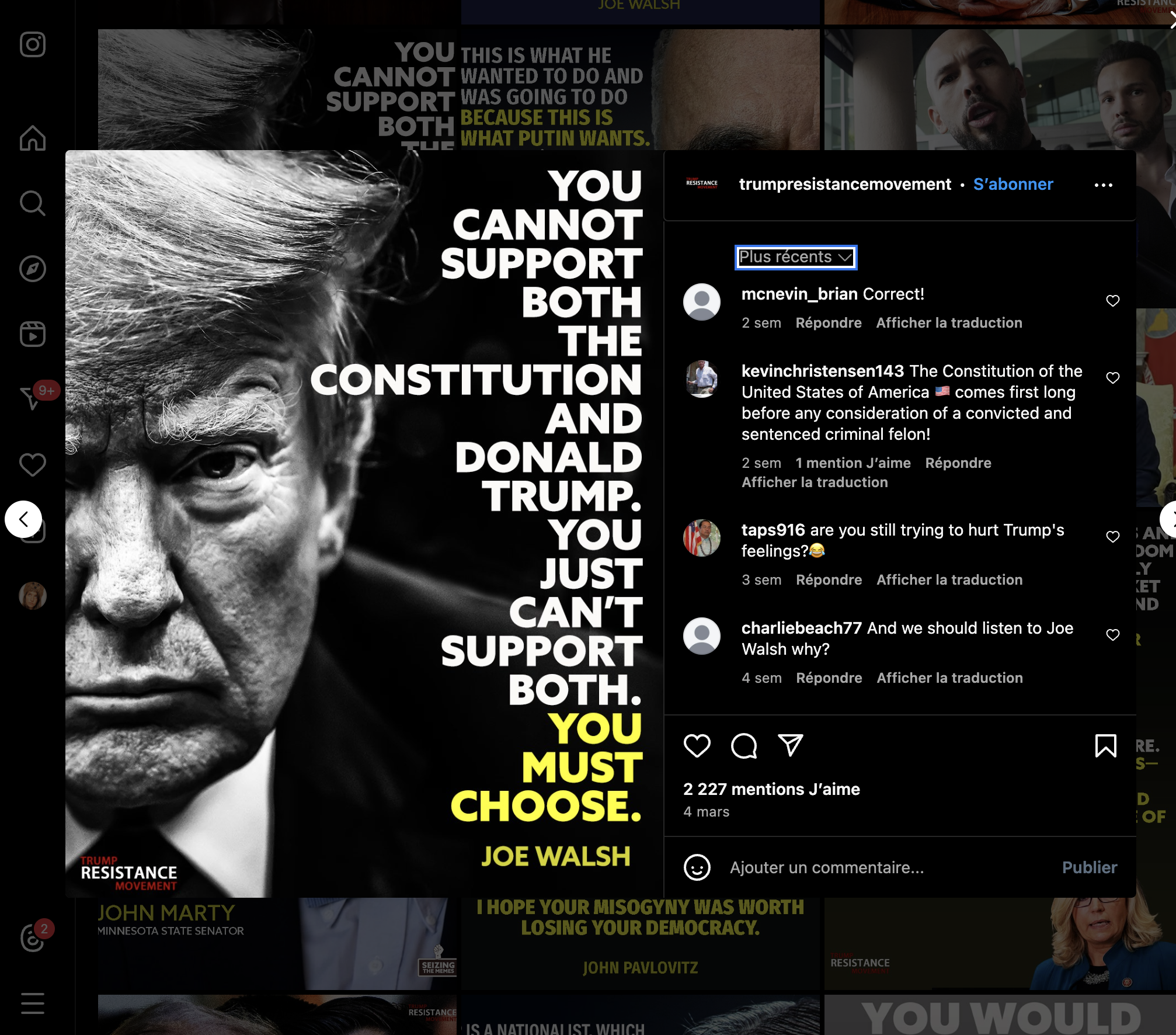 "Quelle requête [a été donnée à l'IA pour générer cette image] ? Quid des codes graphiques choisis : sachant que la campagne a débuté avec le duo Trump/Poutine, est-elle inspirée de la campagne américaine « Trump Resistance Movement » qui possède les mêmes codes visuels ? On a bien fait (à juste titre) une comparaison en plaçant côte à côte une affiche de propagande nazie et le visuel d'Hanouna, pourquoi ne pas le faire avec cette campagne contre Trump ? Quelle est la chaîne de validation (sans forcément donner des noms) ? Combien de visuels précisément ont été produits, avec quelles personnalités, quelle chronologie ?" se demande un abonné, précisant que ce sont des "questionnements qu'on a habituellement de la part d'ASI et qui là étaient totalement absents". Nassira répond : "Pour moi, la reproduction des codes antisémites est tellement évidente que je passe vite cette étape pour interroger la question du mode haineux en reprenant celle de Gunthert « Faut-il des images de haine pour dénoncer les discours de haine ? »