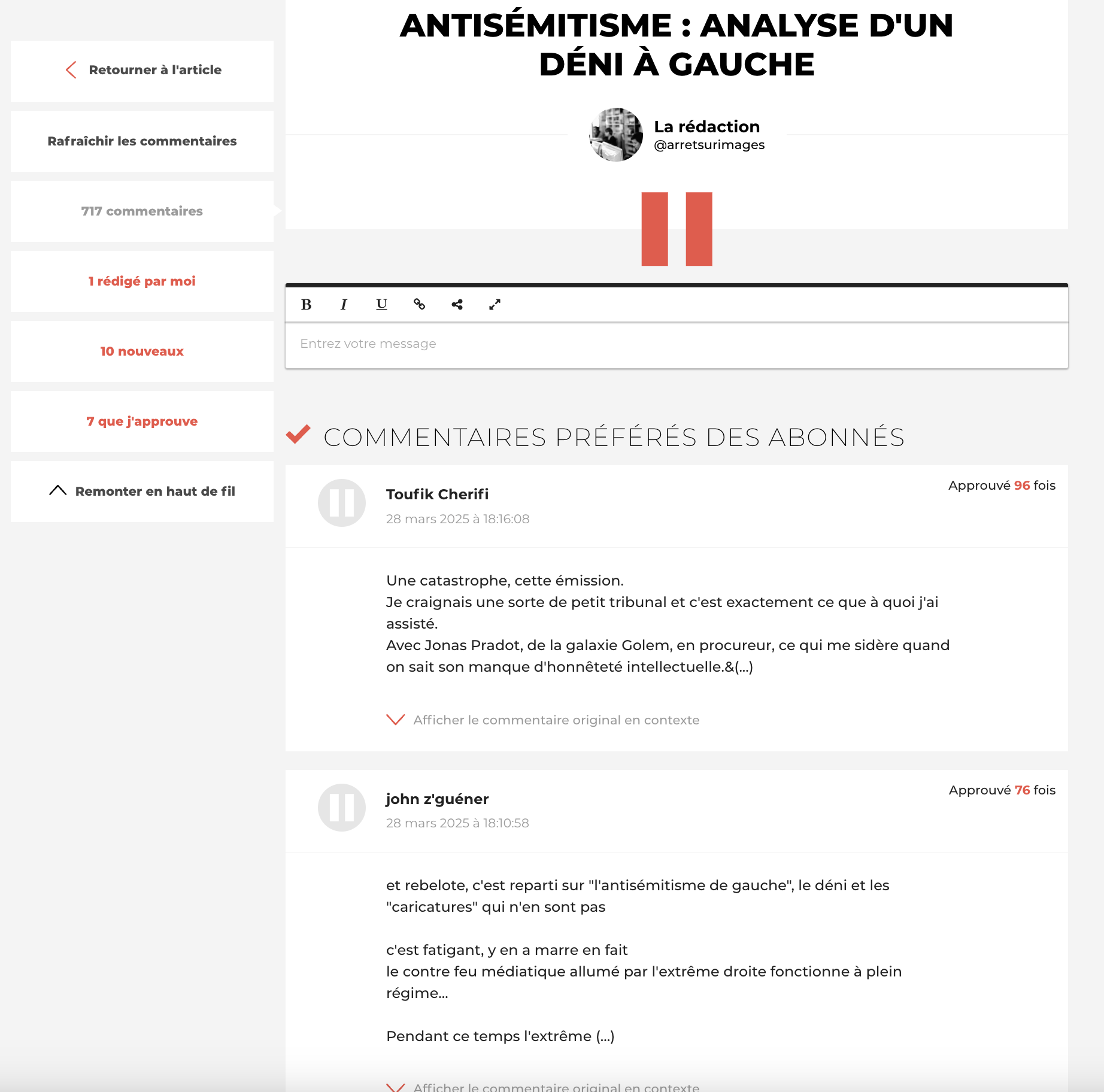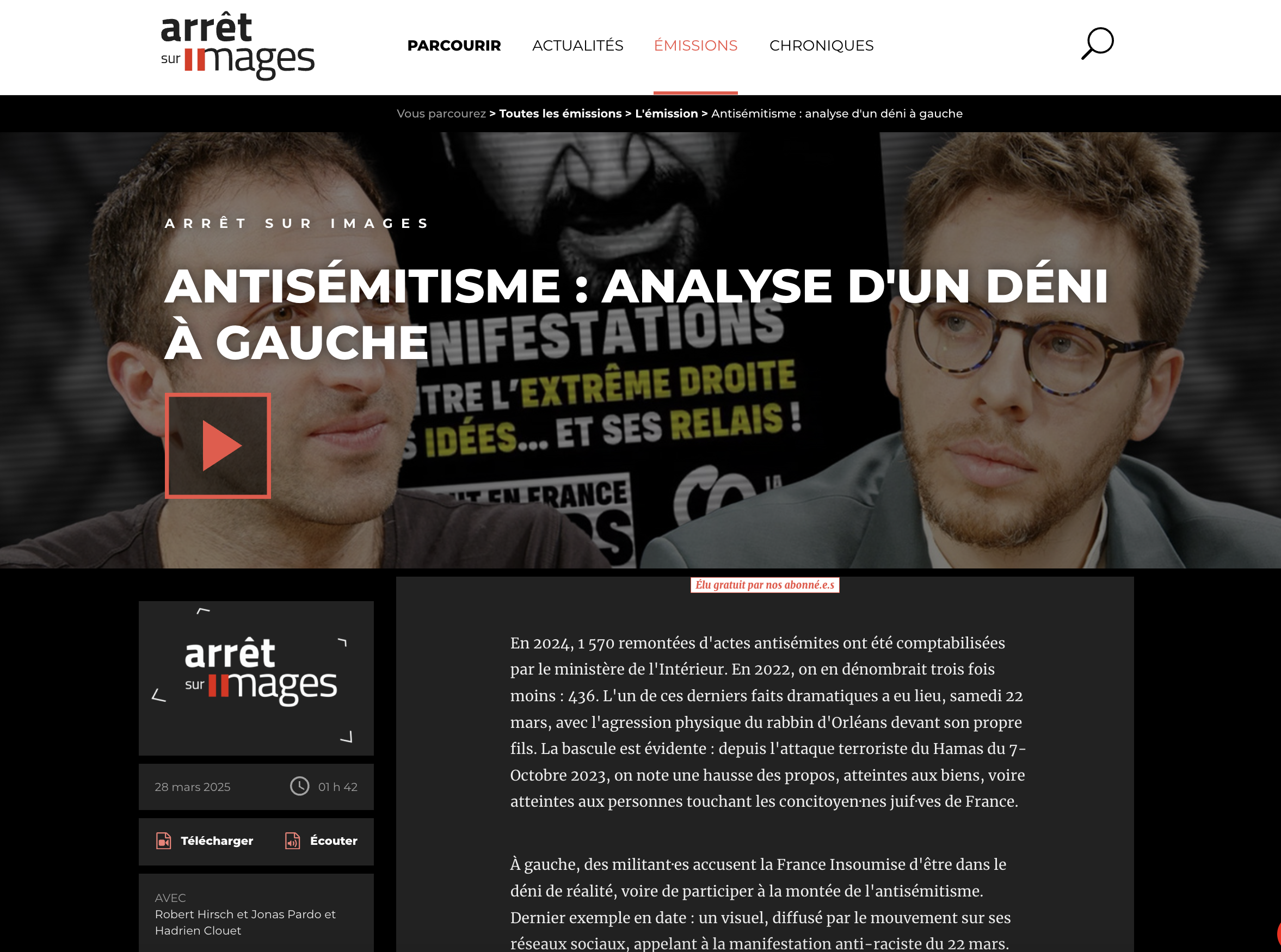 L’émission du 28 mars dernier titrée "Antisémitisme : analyse d'un déni à gauche" a suscité de (très) vives et (très) nombreuses réactions de la part de nos abonnés. 717 commentaires sur le forum (que nous avons tous lus), et des centaines d’autres sur les réseaux sociaux où les commentaires ont été autrement plus violents et virulents, notamment à l’adresse de Nassira El Moaddem qui a préparé et présenté cette émission, comme le déplorait notre rédacteur en chef et directeur de la publication, en début de semaine.