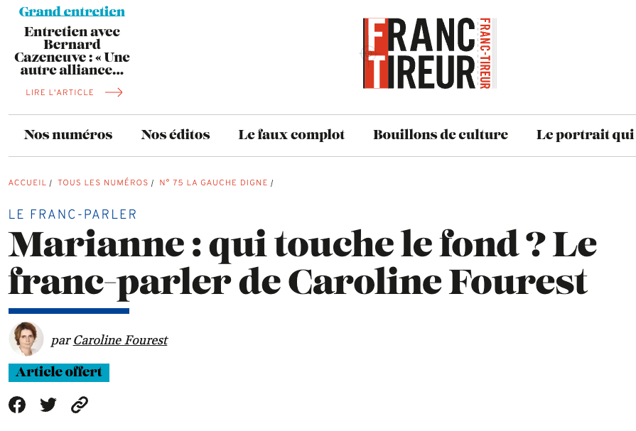 La conclusion de Caroline Fourest vaut également le détour : "Voilà le vrai scandale. Constater que les attentats tout juste passés et les cadavres à peine froids toutes les initiatives prises pour endiguer le séparatisme sont en passe d'être salies ou enterrées." Le problème quand on raconte n'importe quoi, c'est qu'on finit par s'en prendre à tout le monde, et pas n'importe qui. Comme à la famille de Samuel Paty, qui juge toute l'affaire comme "une insulte à la mémoire" du professeur assassiné, et réclame l'ouverture d'une enquête. Ils ont dû mal comprendre eux aussi. Finalement, de cet édito de Fourest, il ne fallait garder que le titre : "Marianne : qui touche le fond ?"