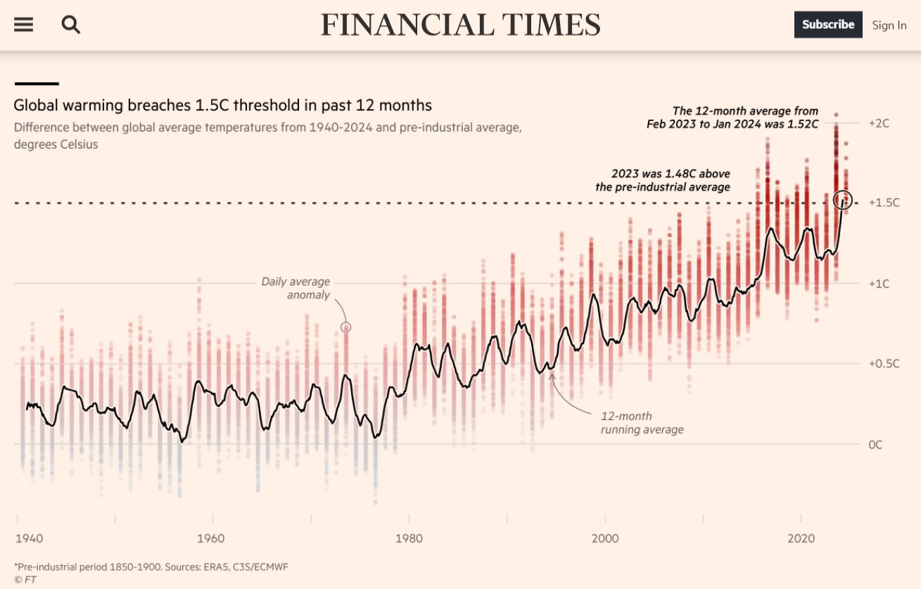 Est-ce la lassitude issue de l'impression d'avoir déjà écrit la même chose 100 fois ? Est-ce l'impossibilité de faire vendre des journaux avec une information déprimante que nous ne voulons pas lire ? Ce jeudi 8 février 2024, l'observatoire européen Copernicus annonce en matinée que la planète a franchi, sur les douze mois de l'année 2023, le seuil des 1,5°C de réchauffement global. La mesure sort suffisamment tôt pour bénéficier d'un cycle complet d'information au sein des médias français : reprises par les chaînes d'information et par l'AFP, mise en valeur de cette nouvelle actualité dramatique sur les pages d'accueil des sites des médias, reportages aux journaux télévisés de 20 heures, jusqu'aux couvertures de journaux du lendemain. Et ce d'autant plus que la journée est marquée par l'annonce que plus de 5 000 personnes sont mortes de la chaleur des canicules de 2023 en France, que les stations de ski manquent plus que jamais de neige, qu'une incroyable chaleur continue de marquer cet hiver en France, et que les inondations se succèdent dans le Pas-de-Calais. Quatre événements directement liés au dérèglement climatique.