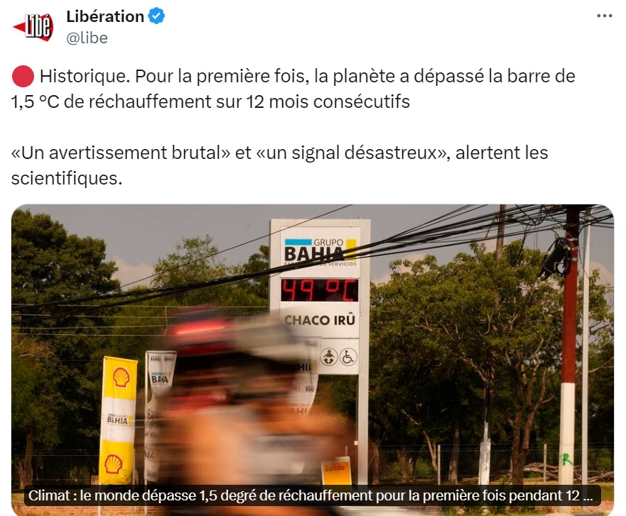 Et puis, le franchissement de ce seuil de 1,5°C sur 12 mois disparaît des journaux. À 16 h 30, une recension des pages d'accueil de la grande presse montre le désintérêt des hiérarchies journalistiques. Sur les sites du Monde, de l'Humanité, de Mediapart, du Figaro, du Parisien : rien, pas un appel de titre, pas même dans les rubriques "environnement" pour les médias en proposant. Dans les pages d'accueil de Libération et de la Croix, après quelques dizaines d'articles portant sur d'autres sujets, figure tout de même un lien vers la dépêche AFP de la matinée – que Libé accompagne d'un post.