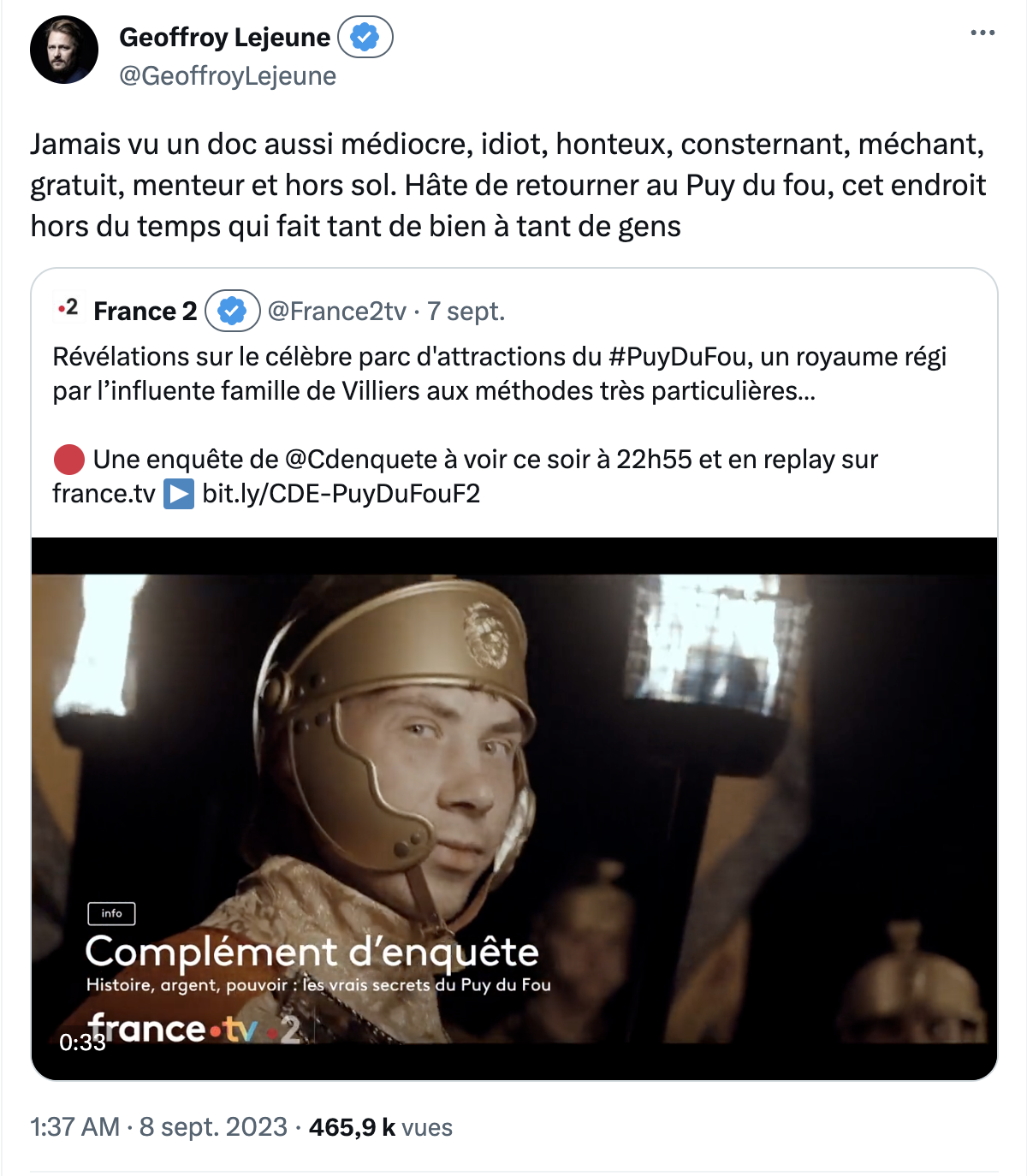 Le 7 septembre, France 2 consacrait un numéro de Complément d'enquête au Puy du Fou et à son tout puissant créateur, Philippe de Villiers. Une diffusion qui a déclenché une levée de boucliers gaulois dans les médias estampillés Bolloré… mais pas que. Le 7 septembre au matin, avant même la diffusion de l'enquête, c'est le Figaro, sous la plume d'Eugénie Bastié, fan du Puy devant l'éternel, qui sonne le tocsin : "Enraciné, non capitaliste, antiwoke, moderne sans être progressiste, préférant la pierre au plastique et les chevaliers à Mickey, le Puy du Fou est l'anti-Disney." Bingo. Un détail : Eugénie Bastié ne mentionne jamais Complément d'enquête. Tout juste évoque-t-elle les "reportages à charge" dont le parc fait l'objet. Les lecteurs du Figaro n'en sauront pas plus. Et pourtant, à lire la ligne de défense choisie par Bastié, on devine qu'elle a entrevu le Complément qui doit être diffusé le soir-même : "Le bénévolat local est au cœur du succès du parc. […] Ce réseau familial et local est l'âme vivante de ce parc qui fait qu'il ne ressemble à aucun autre au monde." Une question, la légalité de ce recours massif au bénévolat, qui est au cœur de l'enquête de France 2.
