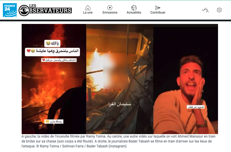 et interviewe Bader Tabash qui a filmé la scène : "Nous étions retournés nous reposer après avoir couvert le massacre perpétré contre la famille Al-Naffar, dans le centre de Khan Younès, lorsque nous avons été surpris par une explosion vers 2 h 30. La tente de Palestine Today était en feu". Libération le traite dans un papier CheckNews, tout comme Les Observateurs de France 24, auprès de qui le journaliste palestinien Ramy Toima (qui a tenté de venir en aide à ses collègues et a documenté les faits sur son compte Instagram) confirme que la tente était clairement connue et identifiée comme abritant des journalistes. Ce qu'assure également Jonathan Dagher, responsable du bureau Moyen-Orient de Reporters sans frontières.