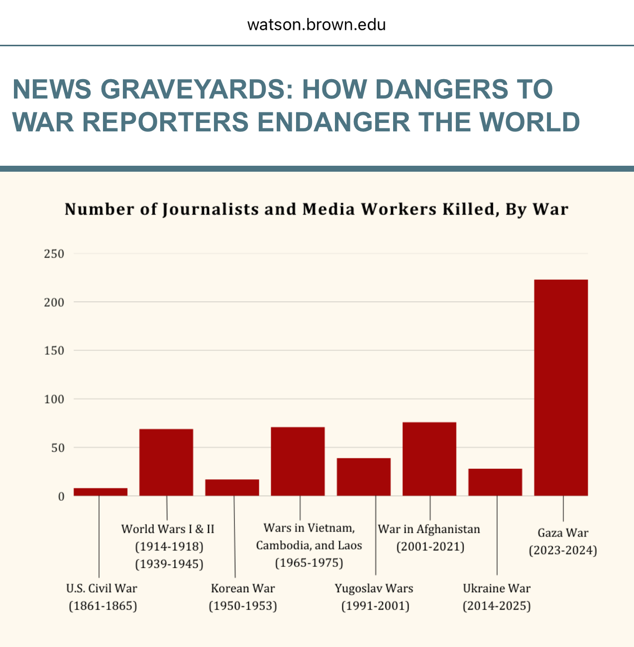 Selon les différents décomptes (de la Fédération Internationale des Journalistes ; du CPJ ; de l'initiative Stop Murdering Journalists), près de 200 journalistes et employés de médias ont été tués depuis le début de l'offensive israélienne à Gaza suite aux attaques terroristes du 7-Octobre. Un rapport publié par l’université américaine Brown établit que ce chiffre dépasse le total de ceux tués durant les deux guerres mondiales, et cinq autres conflits majeurs depuis la Guerre de Sécession en cumulé.
