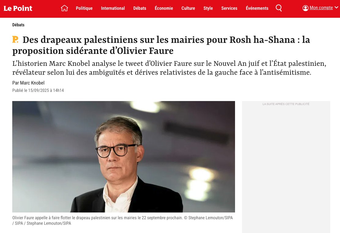 Le Point va même jusqu'à titrer "Des drapeaux palestiniens sur les mairies pour Rosh ha-Shana"