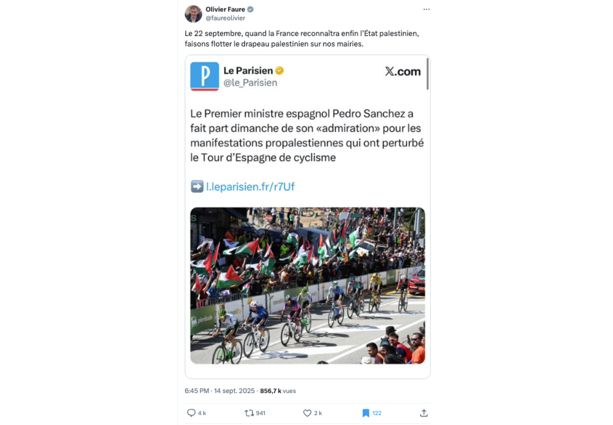 pour les manifestations propalestiniennes lors du Tour d'Espagne de cyclisme, accompagné du commentaire : "Le 22 septembre, quand la France reconnaîtra enfin l'État palestinien, faisons flotter le drapeau palestinien sur nos mairies".