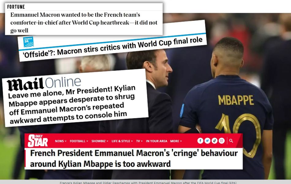 l'attitude malaisante" du président français, tandis que le Daily Mail moque ses "tentatives maladroites et répétées" en faisant dire à Mbappé : "Laissez-moi tranquille, monsieur le président !" Le New York Times fait passer le message avec plus de raffinement mais tout autant d'humour, ouvrant son article sur ces mots : "Le président de la France attendait patiemment sur l'herbe, mais Kylian Mbappé n'était pas prêt à être consolé… Pas encore. Le président français devrait attendre."