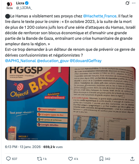 La semaine dernière, un tweet de la LICRA dénonçait l'extrait d'un livre parascolaire de révision du Bac ("Objectif Bac") publié par Hachette Éducation décrivant les attaques terroristes du 7-Octobre de la façon suivante : "En octobre 2023, à la suite de la mort de plus de 1 200 colons juifs lors d'une série d'attaques du Hamas, Israël décide de renforcer son blocus économique et d'envahir une grande partie de la bande de Gaza, entraînant une crise humanitaire de grande ampleur dans la région". Une dérive "confusionniste" et "négationniste" pour l'association qui ne veut pas croire à une "simple" erreur : "Le Hamas a visiblement ses proxy chez Hachette"