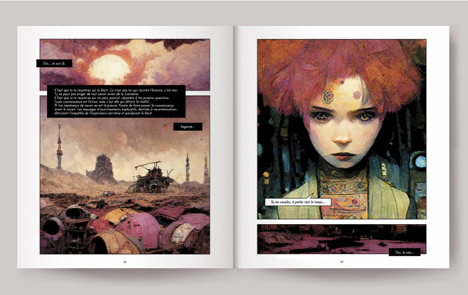 . Le sujet ? Paradoxalement, une dénonciation de l'algorithmisation du monde, et une exploration angoissée de la frontière mouvante homme-machine. J'ai tenu entre les mains cet album mutant. Passé le premier moment "Waouh" (il y a toujours un moment waouh avec les IA), le scénario s'est révélé prévisible et ennuyeux. Mais après tout, combien d'albums garantis 100% humains, sont-ils tout aussi plats et ennuyeux ?