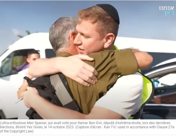 , dit le jeune homme. Je m’appelle Meir Spanier. J’ai voté pour [le ministre de la Sécurité nationale Itamar] Ben Gvir [du parti d’extrême-droite Otzma Yehudit] lors du dernier scrutin. J’étais imprégné du poison que la droite a déversé sur la gauche. Je le haïssais [Golan]. Aujourd’hui, je l’aime et je l’admire. Et je suis vraiment désolé."