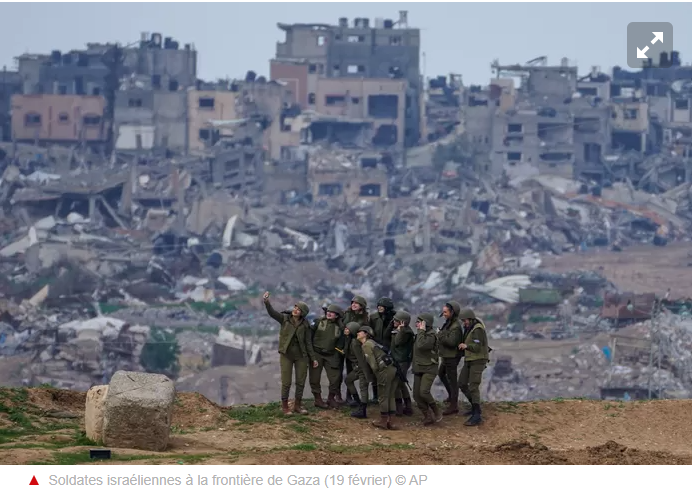D'abord les ruines et le groupe. Le crénelé des ruines, un groupe de soldats : pas de doute, c'est Gaza. Ensuite l'alignement du groupe, et le bras tendu, immédiatement identifiable pour tout spectateur de 2024 : un membre du groupe prend un selfie. Le selfie de la jubilation, de la victoire, sur les ruines et certainement les cadavres, invisibles, qu'elles recouvrent encore. Génoselfie ? Selfinocide ?