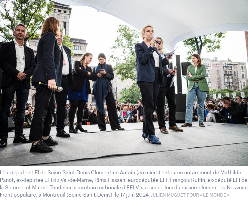 De mémoire d'observateur de campagnes, ce fut un moment sans précédent. Du meeting de lancement du nouveau Front Populaire (NFP), lundi soir à Montreuil (93), restera cette image irréelle, où se côtoyèrent purgeurs et purgés. A la tribune, les duos Panot / Hassan et Ruffin / Autain. Rima Hassan y a soutenu implicitement la candidate officielle NFP Sabrina Ali Benali, tandis que François Ruffin (comme Olivier Faure) soutenait explicitement le dissident NFP Alexis Corbière. Que Panot et Hassan aient ostensiblement consulté leurs portables pendant les discours de Autain et Ruffin, ou qu'une obscure opération de lecture sur lèvres ait été montée contre Corbière, ne minore pas l'événement : ce moment a existé.