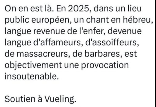 Quant au personnel de bord de la Vueling, sans doute n'était-il pas plus renseigné que moi. Sans doute n'a-t-il vu et entendu que des adolescents perturbant les consignes de sécurité, en criant des choses qu'ils ont peut-être, sans que ce soit certain, identifié comme de l'hébreu.