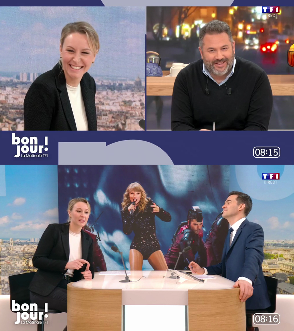 , laissée à Bruce Toussaint. Lequel essaye de détendre un peu l'atmosphère. Avec des questions essentielles, comme celle posée à Marion Maréchal : "La chanteuse américaine Taylor Swift a appelé ses fans à voter aux Etats-Unis et à s'inscrire sur les listes électorales pour la prochaine élection présidentielle et ça a bien marché (...). Résultat : l'Union européenne envisage à son tour de faire appel à Taylor Swift pour mobiliser les jeunes pour les Européennes. C'est une bonne idée ou pas ?"