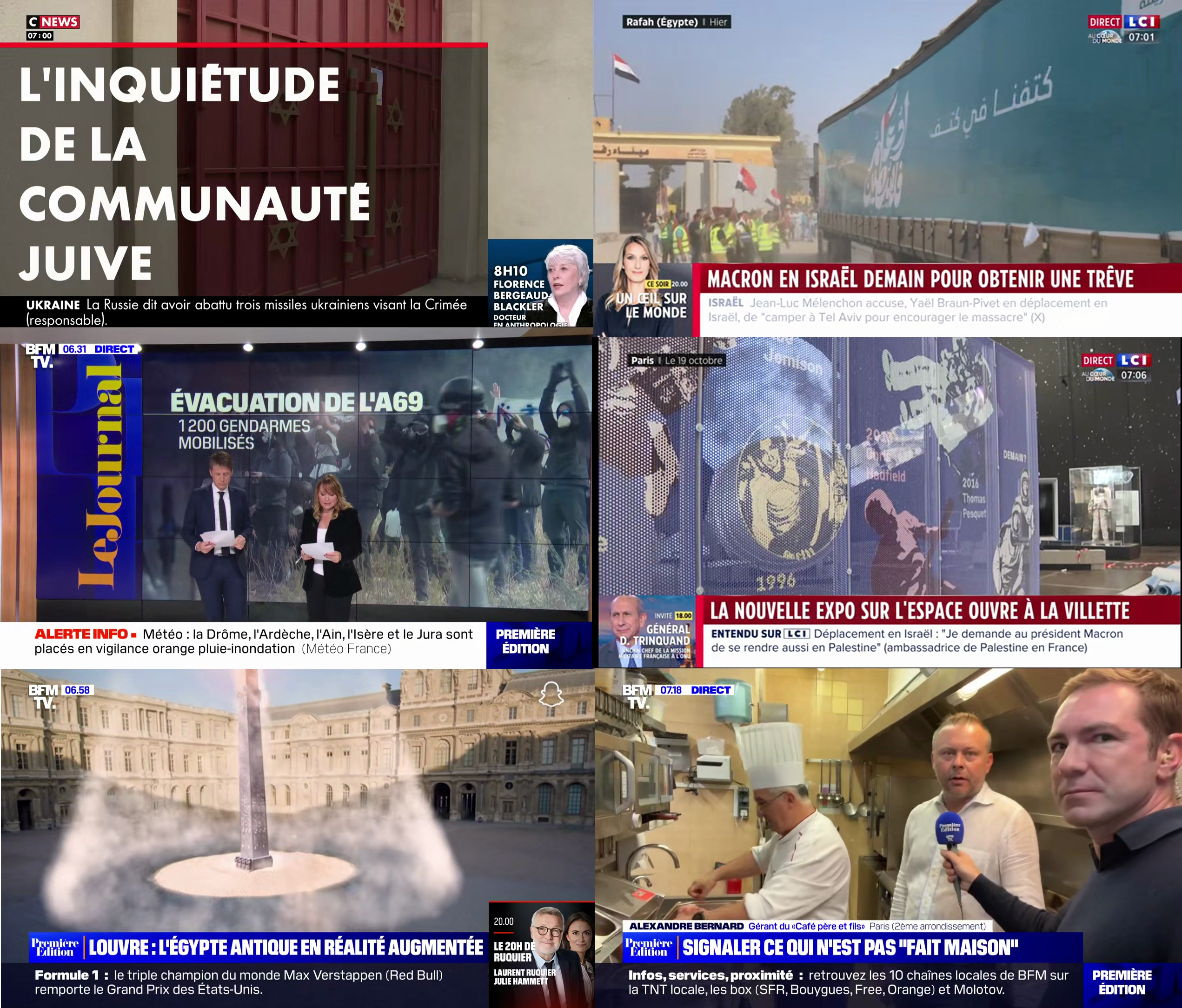 Regarder les chaînes d'info en prenant le petit déjeuner à 7h, comme ce lundi 23 octobre, c'est accepter directement de monter dans un grand huit, avec une alternance de titres graves et de sujets plus légers. Ce matin-là, sur les trois chaînes d'info (BFMTV, CNews et LCI), il est question de la guerre Israël/Hamas, de la recrudescence des actes antisémites en France, des manifestations contre le projet autoroute A69… mais aussi de la possibilité de découvrir des œuvres de l'Egypte antique en réalité augmentée au Louvre, de la nouvelle expo sur l'espace qui ouvre à la Villette à Paris. Sans oublier le duplex iconoclaste d'un envoyé spécial de BFMTV dans la cuisine d'un restaurant du 2e arrondissement sur le thème du "fait maison".