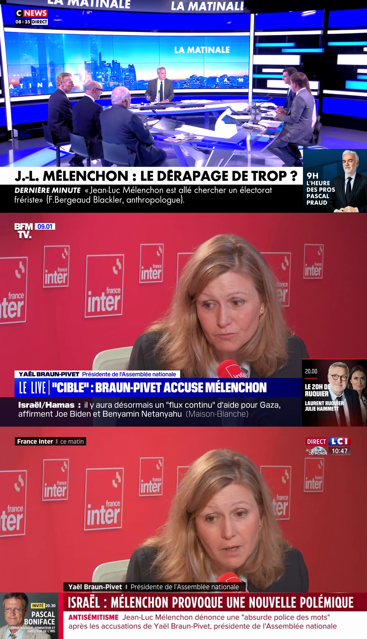 Bref, à 7h du matin, pas de polémique en vue sur les chaînes d'info. Jusqu'à une interview de Braun-Pivet sur France Inter à 8h20, dont le verbatim et l'extrait vidéo vont être repris par les trois chaînes. Avec par ordre d'arrivée : CNews (verbatim dès 8h35), suivi par BFMTV (9h01), puis LCI (10h47).
