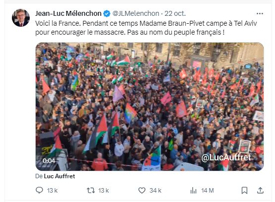 va susciter l'indignation du chef de file des Insoumis, lequel va publier le tweet suivant, dimanche 22 octobre, le jour où se tenait une manifestation pro-palestinienne à Paris :
