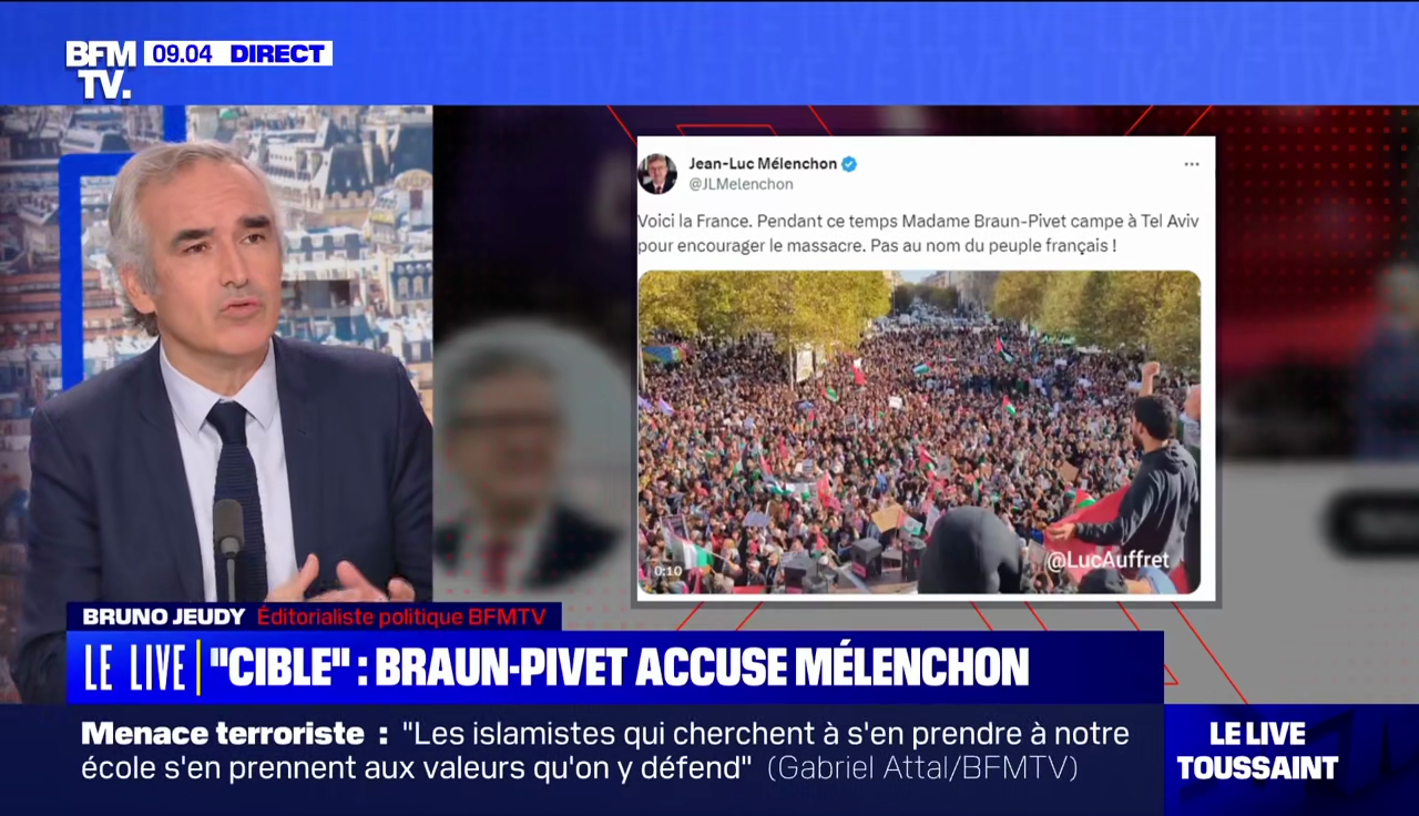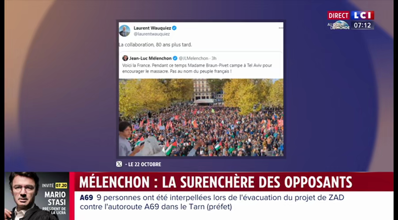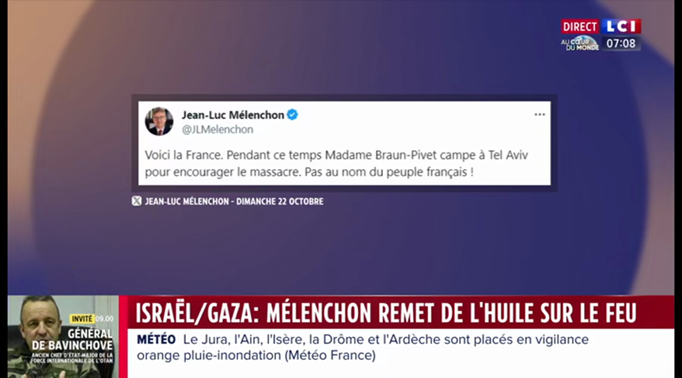 L'extrait en question est une réponse à un tweet de Mélenchon, qui était lui-même une réponse à des déclarations de Braun-Pivet en Israël. Oui, va falloir suivre : toute cette histoire est une cascade de réponses à des réponses.