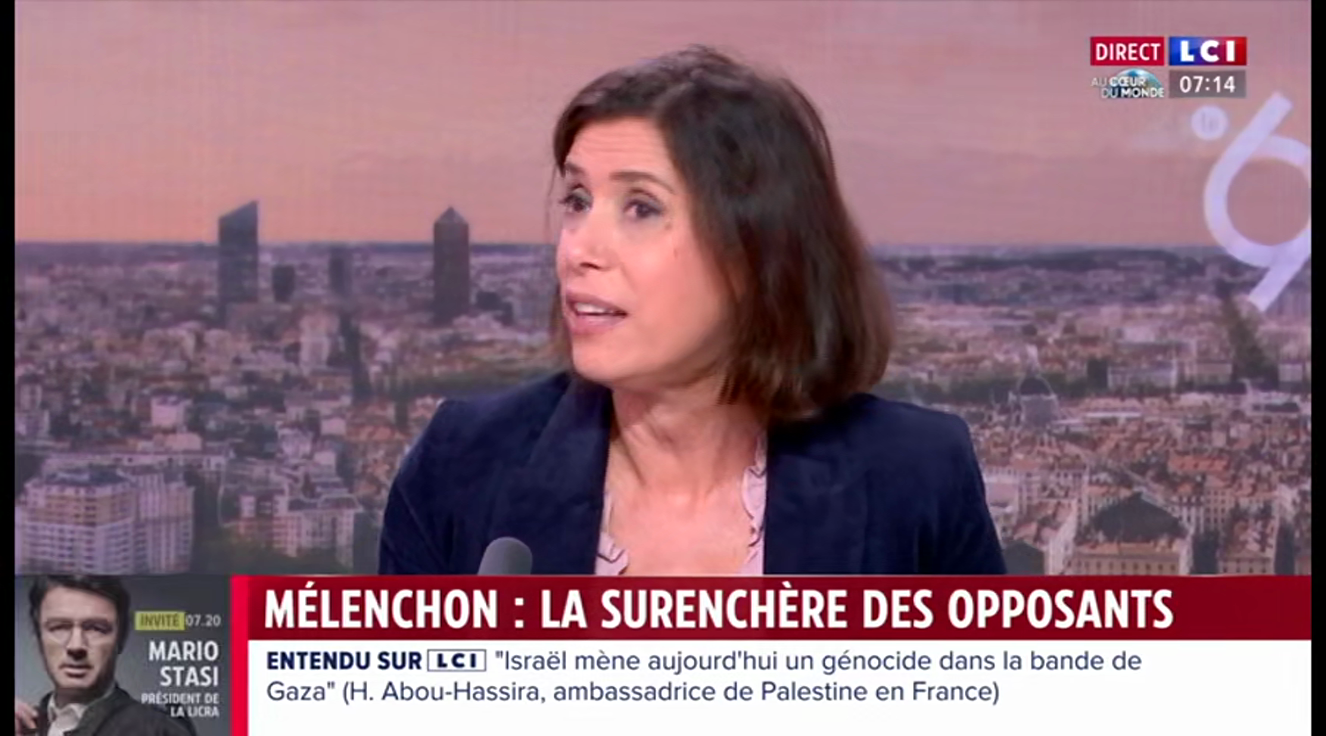 A 7h14, Soazig Quéméner revient sur le tweet de Mélenchon. A-t-elle remarqué le mot "camper" ? Pas du tout. Elle voit surtout la vidéo de la manifestation pro-palestinienne sous son texte : "Ce que fait Jean-Luc Mélenchon depuis le début, depuis le 7 octobre, c'est pas des tweets à l'emporte-pièce, c'est pas des tweets de quelqu'un qui s'énerve derrière son clavier, il y a un but idéologique et politique, c'est d'être le porte-voix d'une partie de la communauté musulmane."