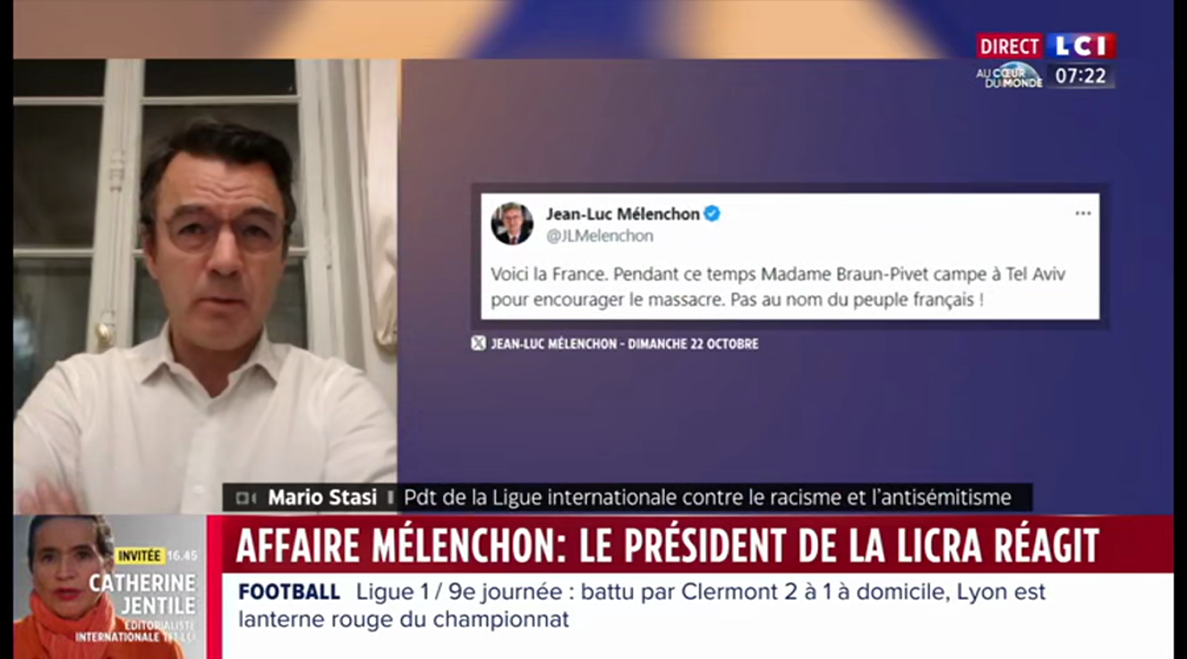 A 7h21, c'est Mario Stasi, le président de la LICRA (la ligue internationale contre le racisme et l'antisémitisme) qui est interrogé sur LCI. Il est très remonté contre Mélenchon. Mais toujours pas à cause du mot "camper" : "Jean-Luc Mélenchon a choisi ses mots. Encourager le massacre, c'est pas un mot de colère, c'est profondément maintenant ce qu'il pense. (...) Tout ça est indigne d'un homme politique qui est censé représenter la nation. On ne joue pas avec les mots comme il le fait, on ne provoque pas comme il le fait. Et s'il pense réellement ce qu'il a dit de madame Yaël Braun-Pivet, c'est indigne de la République."