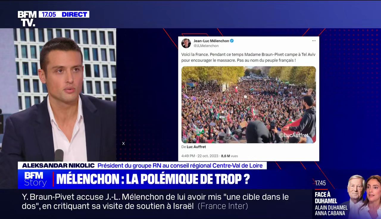 Au même moment sur BFMTV, Bruno Jeudy n'est pas loin de penser la même chose : "C'est un tweet assez répugnant, il faut le dire. Le mot "camper", madame Braun-Pivet a raison, c'est un mot évidemment qui fait écho, il n'est pas choisi par hasard (...) Jean-Luc Mélenchon aime la langue française, il connaît son histoire, il connaît l'Histoire du pays, l'Histoire de la République, il sait ce qu'il fait, et ce mot ne relève pas du hasard".