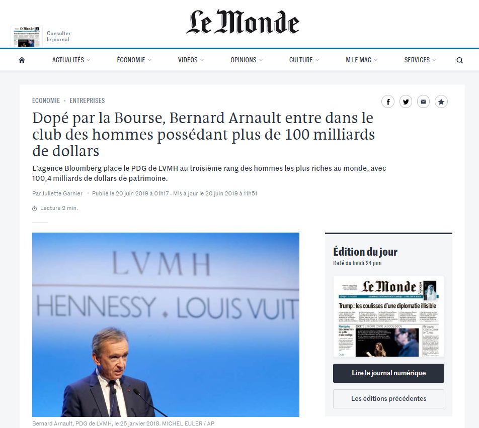 S'ensuivent quelques minutes de débat sur le problème du creusement des inégalités. Et c'est tout. Ce bref échange, diffusé le 20 juin sur C8, est la seule séquence télé où l'annonce de l'agence Bloomberg fait l'objet d'un pseudo-débat contradictoire. Car pour les autres télés, c'est la fête : figurez-vous que la fortune de Bernard Arnault vient de franchir la barre symbolique des 100 milliards de dollars.