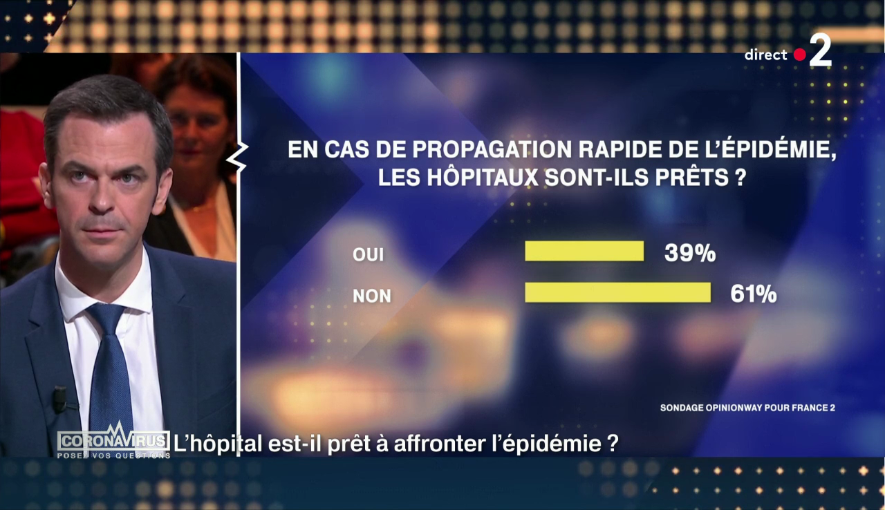 Ouh, ça va chauffer avec le ministre ? Eh bien non… En fin d’émission, Cymès va bien lancer le ministre sur l’hôpital. Mais comme ceci : “Avant que vous partiez, je voudrais juste qu’on parle des hôpitaux. Dans notre sondage Opinon Way pour France 2, on a demandé : “En cas de propagation rapide de l’épidémie, les hôpitaux sont-ils prêts ?”