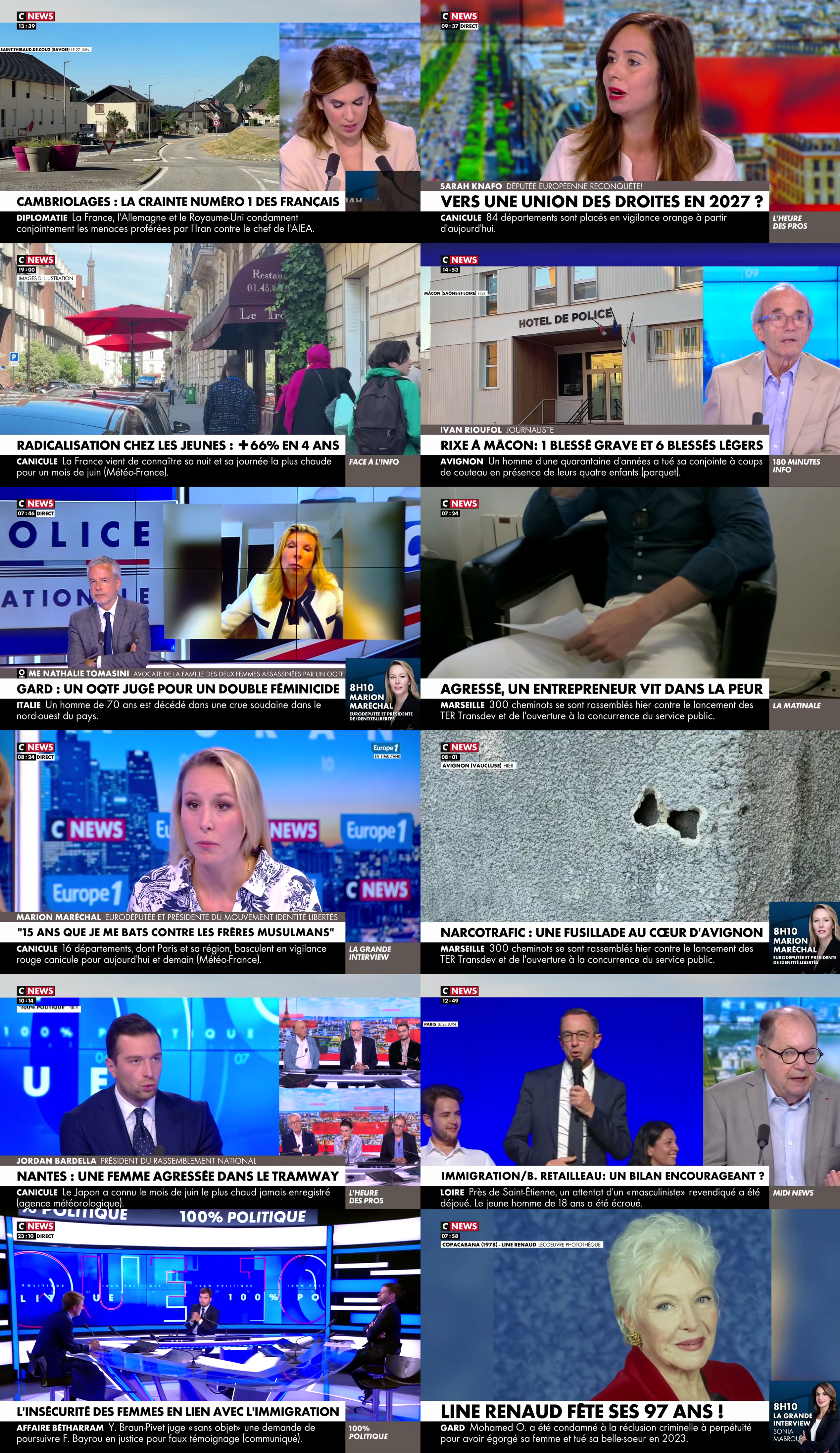 Du lundi 30 juin au mercredi 2 juillet, nous avons regardé CNews, la première chaîne d'info de France (et la 5e chaîne nationale au mois de juin, nouveau record d'audience). Trois jours chez Bolloré, c'est l'assurance de croiser des OQTF, des agresseurs, des cambriolages, une fusillade, une rixe, Sarah Knafo, Marion Maréchal, Jordan Bardella, les frères musulmans, l'islamisme, la radicalisation, Bruno Retailleau (avec "son bilan encourageant"